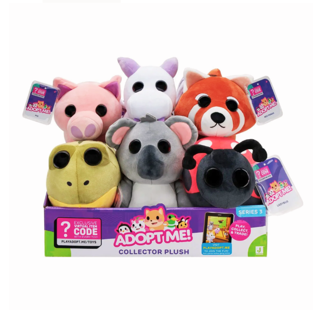 Discover the adorable Collector Plush series inspired by the popular game, Adopt Me! Which of these six charming pets will you bring home? Choose from the pig, lavender dragon, bullfrog, red panda, koala, or ladybug. With these ultra-soft 8” plush pets, you can adopt, nurture, and snuggle your favorite Adopt Me companion. Each plush is meticulously crafted to mirror its in-game counterpart, available in various rarities from common to legendary. Perfect for playtime, cuddling, or showcasing, these collectible plush pets are a must-have for fans. Start your collection today and adopt them all!