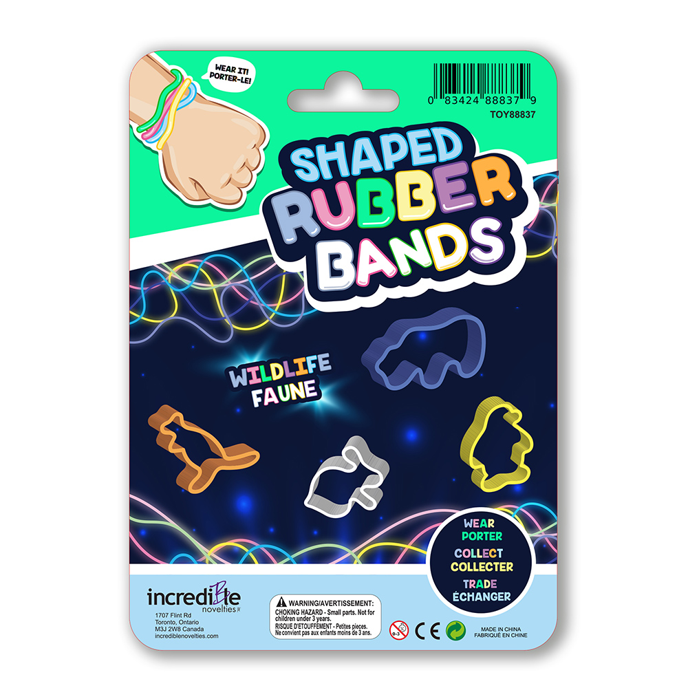 Wear! Collect! Trade! Fun Shaped Rubber bands in Trending themes that will return to their original shape after use. You can collect all of the different themed packages of rubber bands to wear, and trade with your friends! Contains 6 rubber bands per package. Age 3+