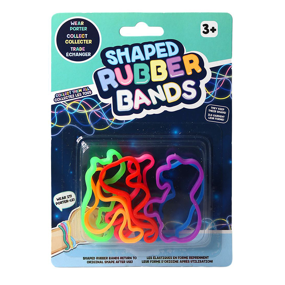 Wear! Collect! Trade! Fun Shaped Rubber bands in Trending themes that will return to their original shape after use. You can collect all of the different themed packages of rubber bands to wear, and trade with your friends! Contains 6 rubber bands per package. Age 3+